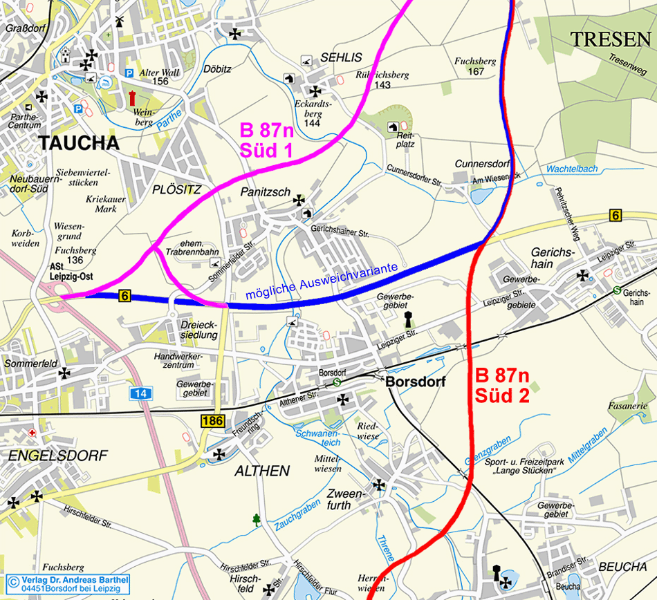 zwischen Panitzsch und Plösitz hindurch, über die Parthe hinweg und über Sehlis weiter nach Osten.Die von der Straße (ohne Geschwindigkeitsbegrenzung!) ausgehende erhebliche Lärm- und Abgasbelastung, kombiniert mit den Einflüssen von A 14 und B 6, und der massive Einschnitt in Natur und Landschaft führen zu einem starken Verlust an Lebensqualität in allen angrehzenden Orten und für jeden Einzelnen von uns.